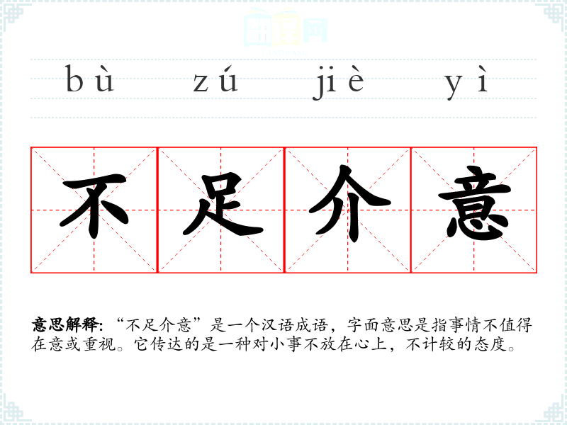 “不足介意”是一个汉语成语,字面意思是指事情不值得在意或重视。它传达的是一种对小事不放在心上,不计较的态度。