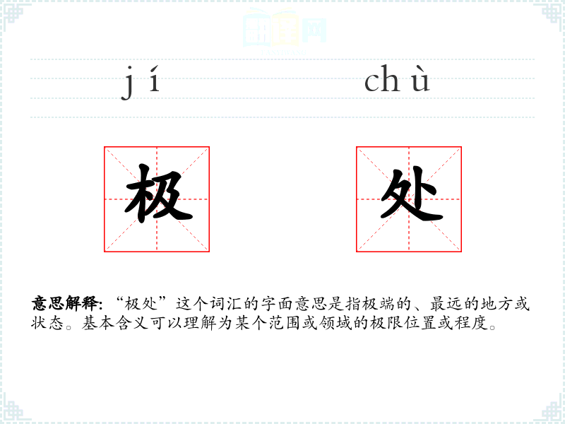 “极处”这个词汇的字面意思是指极端的、最远的地方或状态。基本含义可以理解为某个范围或领域的极限位置或程度。