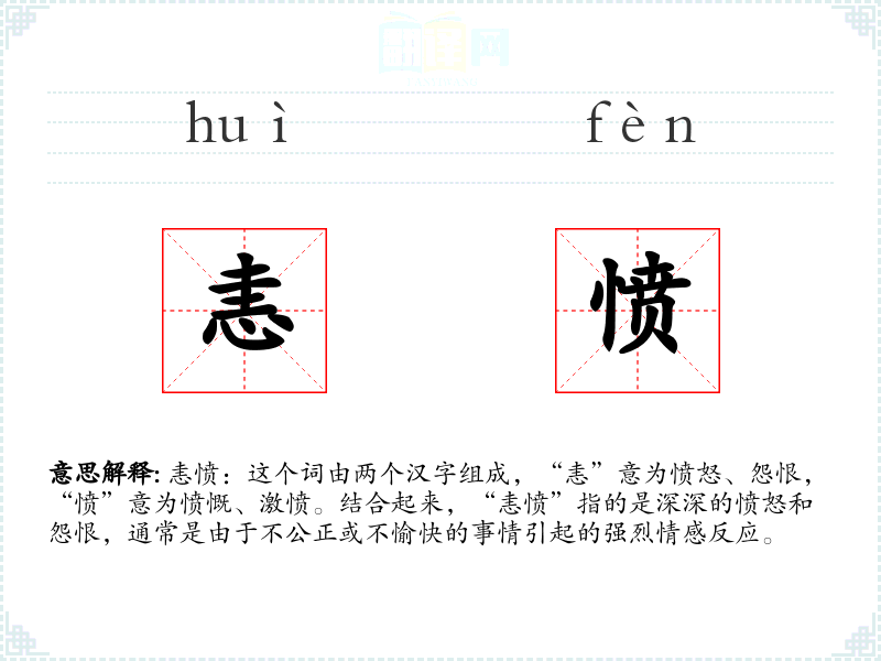 恚愤:这个词由两个汉字组成,“恚”意为愤怒、怨恨,“愤”意为愤慨、激愤。结合起来,“恚愤”指的是深深的愤怒和怨恨,通常是由于不公正或不愉快的事情引起的强烈情感反应。