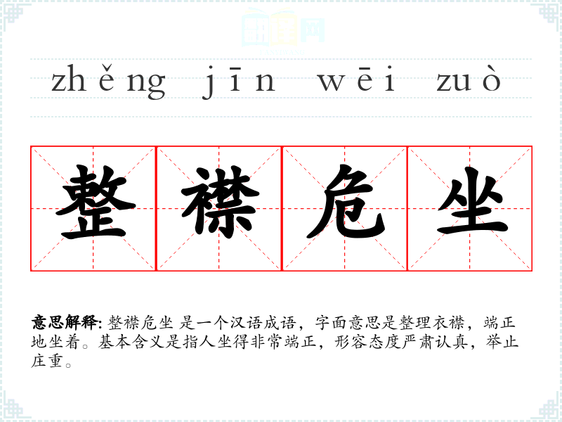 整襟危坐 是一个汉语成语,字面意思是整理衣襟,端正地坐着。基本含义是指人坐得非常端正,形容态度严肃认真,举止庄重。