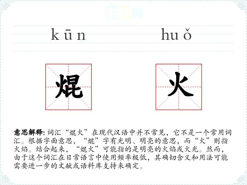 - 由于“焜火”不是一个常用词汇,其词源和历史演变可能需要通过古汉语研究或词源学专家的分析来确定。