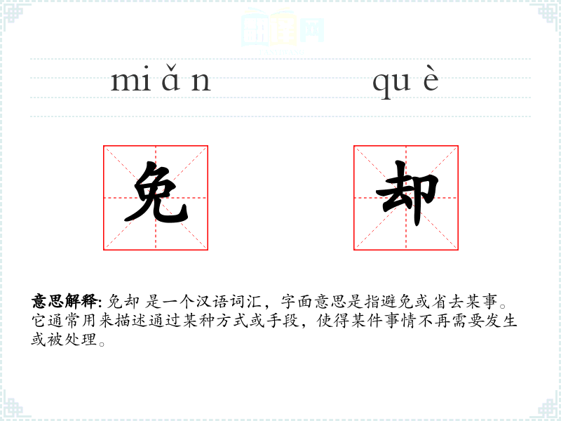 免却 是一个汉语词汇,字面意思是指避免或省去某事。它通常用来描述通过某种方式或手段,使得某件事情不再需要发生或被处理。