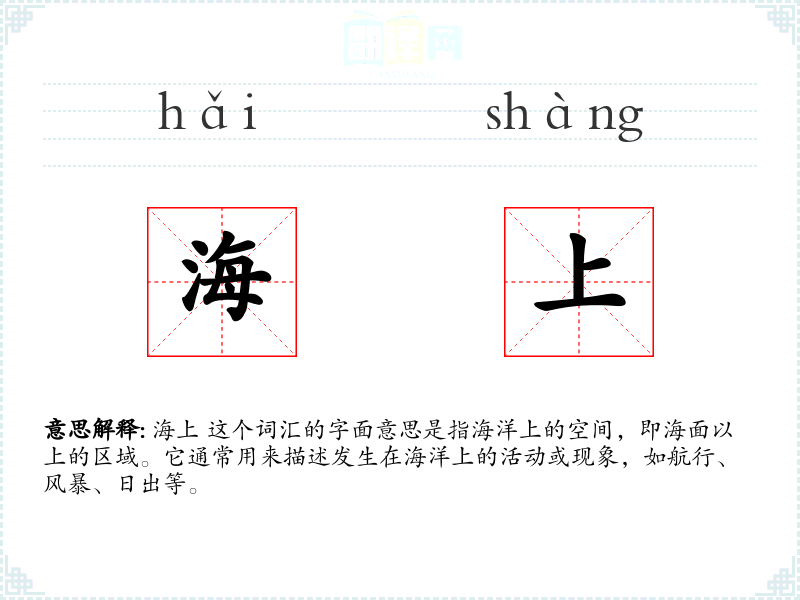 海上 这个词汇的字面意思是指海洋上的空间,即海面以上的区域。它通常用来描述发生在海洋上的活动或现象,如航行、风暴、日出等。