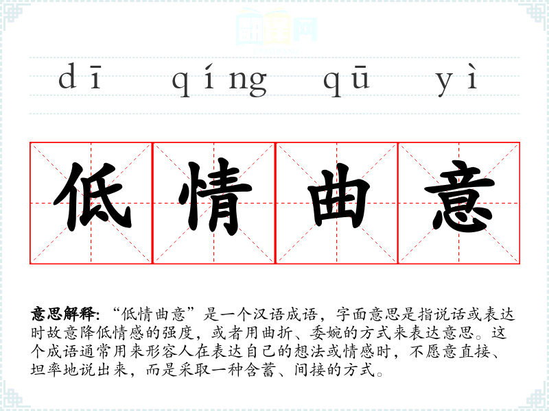 “低情曲意”是一个汉语成语,字面意思是指说话或表达时故意降低情感的强度,或者用曲折、委婉的方式来表达意思。这个成语通常用来形容人在表达自己的想法或情感时,不愿意直接、坦率地说出来,而是采取一种含蓄、间接的方式。