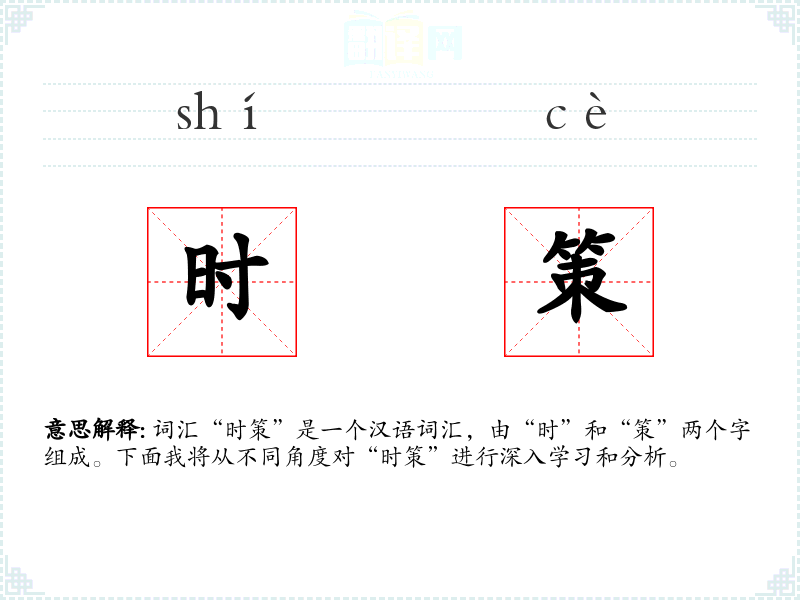 词汇“时策”是一个汉语词汇,由“时”和“策”两个字组成。下面我将从不同角度对“时策”进行深入学*和分析。