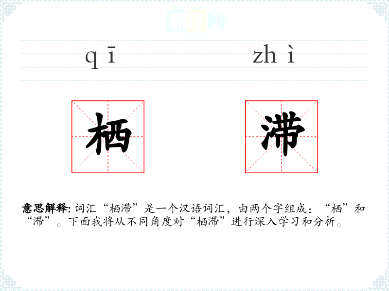 词汇“栖滞”是一个汉语词汇,由两个字组成:“栖”和“滞”。下面我将从不同角度对“栖滞”进行深入学*和分析。