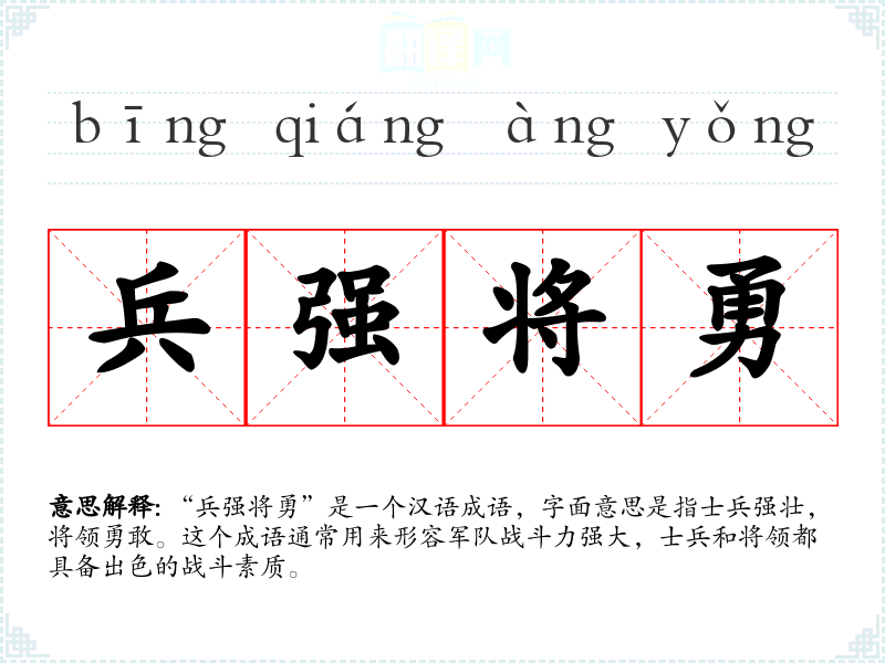 “兵强将勇”是一个汉语成语,字面意思是指士兵强壮,将领勇敢。这个成语通常用来形容军队战斗力强大,士兵和将领都具备出色的战斗素质。