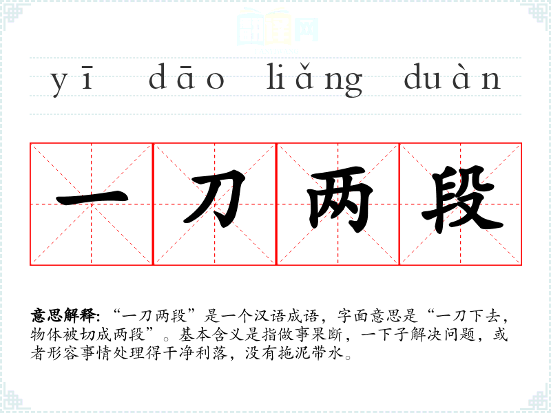 “一刀两段”是一个汉语成语,字面意思是“一刀下去,物体被切成两段”。基本含义是指做事果断,一下子解决问题,或者形容事情处理得干净利落,没有拖泥带水。