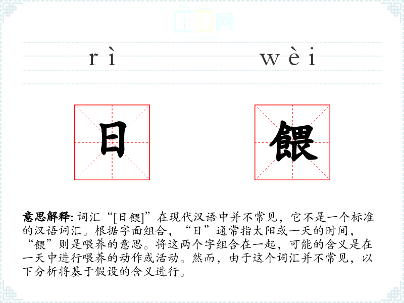 词汇“[日餵]”在现代汉语中并不常见,它不是一个标准的汉语词汇。根据字面组合,“日”通常指太阳或一天的时间,“餵”则是喂养的意思。将这两个字组合在一起,可能的含义是在一天中进行喂养的动作或活动。然而,由于这个词汇并不常见,以下分析将基于假设的含义进行。