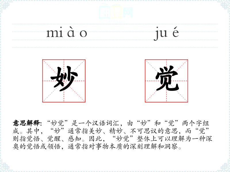 在文学作品中,“妙觉”常用来形容人物对某种真理或境界的深刻领悟,如佛家所说的“开悟”或“觉悟”。在口语中,这个词可能不太常用,但在某些专业领域,如哲学、**或心理学中,它可能被用来描述一种超越常规认知的体验。