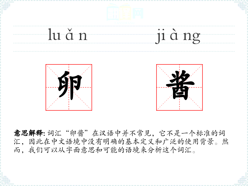 词汇“卵酱”在汉语中并不常见,它不是一个标准的词汇,因此在中文语境中没有明确的基本定义和广泛的使用背景。然而,我们可以从字面意思和可能的语境来分析这个词汇。
