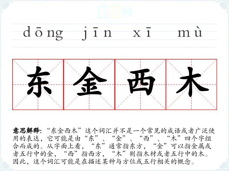 “东金西木”这个词汇并不是一个常见的成语或者广泛使用的表达,它可能是由“东”、“金”、“西”、“木”四个字组合而成的。从字面上看,“东”通常指东方,“金”可以指金属或者五行中的金,“西”指西方,“木”则指木材或者五行中的木。因此,这个词汇可能是在描述某种与方位或五行相关的概念。