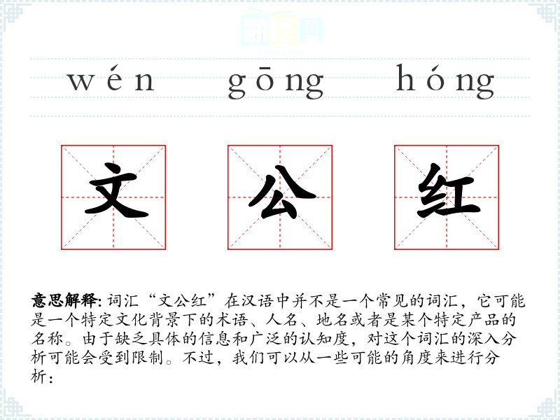 由于“文公红”不是一个常见的词汇,对其的理解和应用可能需要更多的具体信息和背景知识。在语言学习和表达中,了解词汇的具体背景和用法是非常重要的。