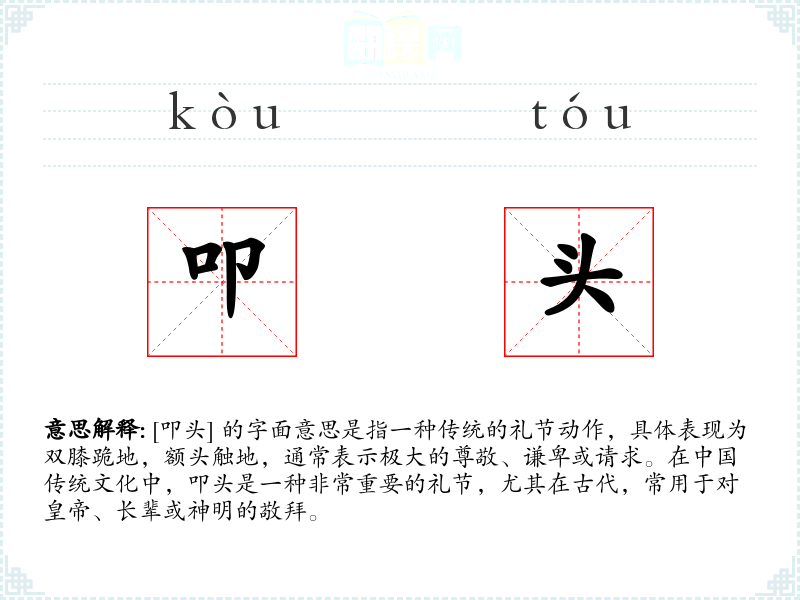 [叩头] 这个词不仅仅是一个动作的描述,它承载着丰富的文化和社会意义。在语言学*和表达中,理解这个词的深层含义有助于更好地把握和运用相关的文化知识。