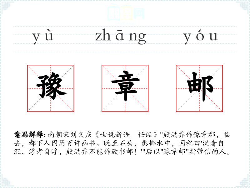 南朝宋刘义庆《世说新语.任诞》"殷洪乔作豫章郡,临去,都下人因附百许函书。既至石头,悉掷水中,因祝曰'沉者自沉,浮者自浮,殷洪乔不能作致书邮!'"后以"豫章邮"指带信的人。