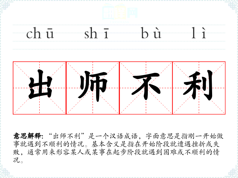 “出师不利”是一个汉语成语,字面意思是指刚一开始做事就遇到不顺利的情况。基本含义是指在开始阶段就遭遇挫折或失败,通常用来形容某人或某事在起步阶段就遇到困难或不顺利的情况。