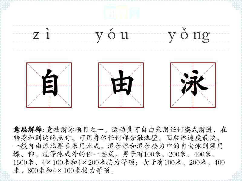 1.竞技游泳项目之一。运动员可自由采用任何姿式游进,在转身和到达终点时,可用身体任何部分触池壁。因爬泳速度最快,一般自由泳比赛多采用此式。混合泳和混合接力中的自由泳则须用蝶、仰、蛙等泳式外的任一姿式。男子有100米、200米、400米、1500米、4×100米和4×200米接力等项;女子有100米、200米、400米、800米和4×100米接力等项。