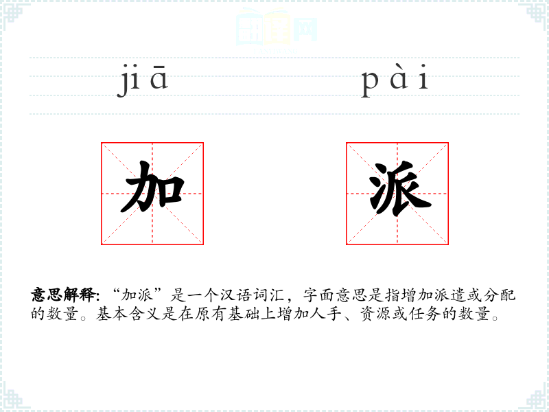 “加派”一词由“加”和“派”两个字组成。“加”意味着增加,“派”意味着派遣或分配。在古代汉语中,“派”已有派遣的含义,而“加”则一直表示增加。随着时间的推移,这两个字组合在一起,形成了“加派”这一现代汉语词汇。