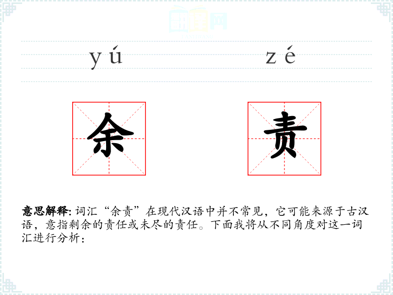 词汇“余责”在现代汉语中并不常见,它可能来源于古汉语,意指剩余的责任或未尽的责任。下面我将从不同角度对这一词汇进行分析: