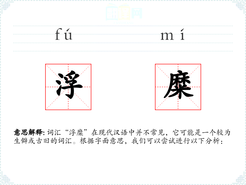词汇“浮糜”在现代汉语中并不常见,它可能是一个较为生僻或古旧的词汇。根据字面意思,我们可以尝试进行以下分析: