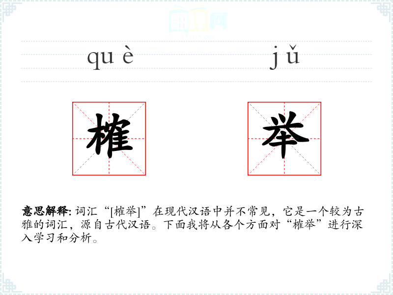 “榷”字最早见于《说文解字》,原意为“商议”,后来引申为“商讨、讨论”。“举”字则有“推举、选拔”的意思。两者结合形成的“榷举”一词,主要用于古代的官员选拔或人才推荐。