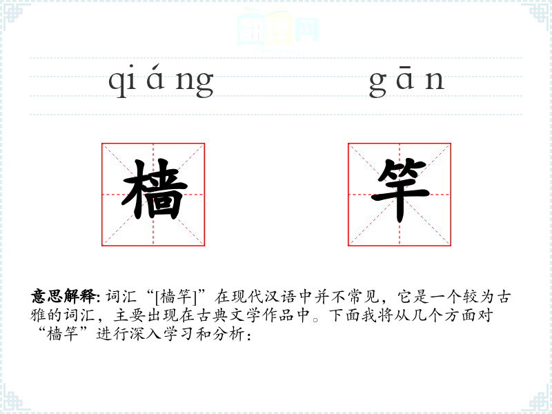 - 反义词:(由于樯竿是一个具体的名词,反义词不适用)