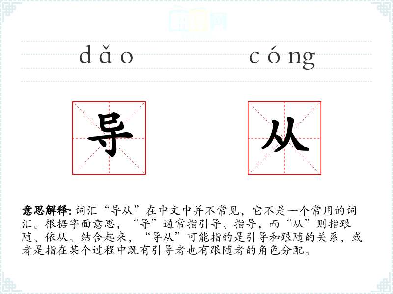 词汇“导从”在中文中并不常见,它不是一个常用的词汇。根据字面意思,“导”通常指引导、指导,而“从”则指跟随、依从。结合起来,“导从”可能指的是引导和跟随的关系,或者是指在某个过程中既有引导者也有跟随者的角色分配。