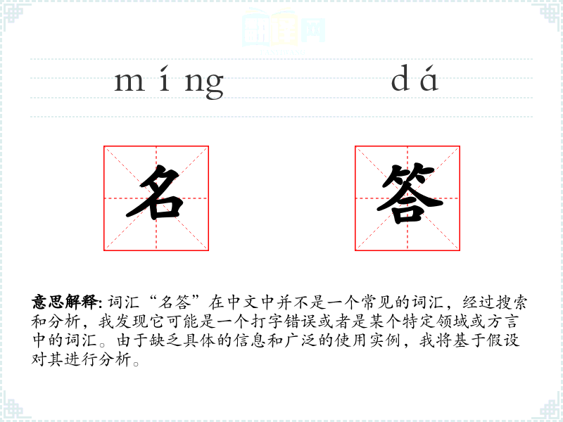词汇“名答”在中文中并不是一个常见的词汇,经过搜索和分析,我发现它可能是一个打字错误或者是某个特定领域或方言中的词汇。由于缺乏具体的信息和广泛的使用实例,我将基于假设对其进行分析。