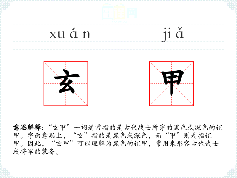 “玄甲”一词通常指的是古代战士所穿的黑色或深色的铠甲。字面意思上,“玄”指的是黑色或深色,而“甲”则是指铠甲。因此,“玄甲”可以理解为黑色的铠甲,常用来形容古代武士或将军的装备。