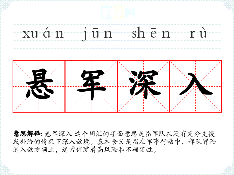 悬军深入 这个词汇的字面意思是指军队在没有充分支援或补给的情况下深入敌境。基本含义是指在军事行动中,部队冒险进入敌方领土,通常伴随着高风险和不确定性。