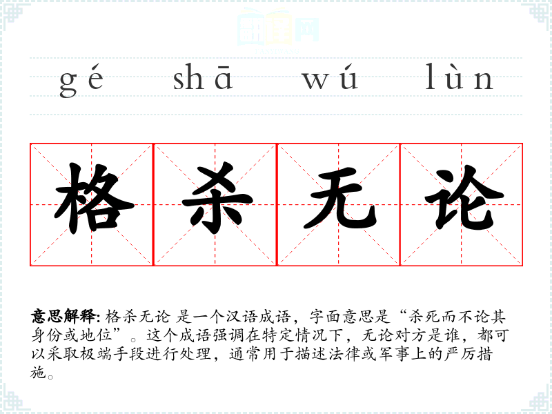 格杀无论 是一个汉语成语,字面意思是“杀死而不论其身份或地位”。这个成语强调在特定情况下,无论对方是谁,都可以采取极端手段进行处理,通常用于描述法律或军事上的严厉措施。