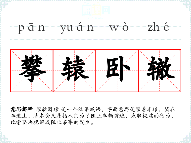 攀辕卧辙 是一个汉语成语,字面意思是攀着车辕,躺在车道上。基本含义是指人们为了阻止车辆前进,采取极端的行为,比喻坚决挽留或阻止某事的发生。