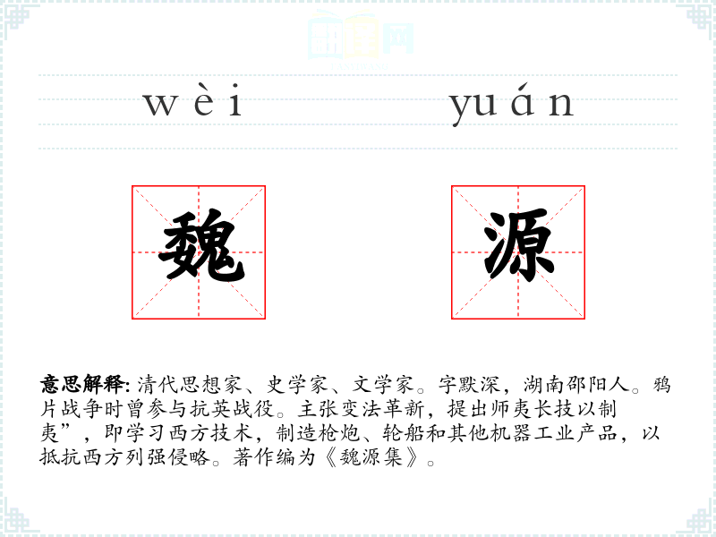 1.清代思想家、史学家、文学家。字默深,湖南邵阳人。鸦片战争时曾参与抗英战役。主张变法革新,提出师夷长技以制夷”,即学习西方技术,制造枪炮、轮船和其他机器工业产品,以抵抗西方列强侵略。著作编为《魏源集》。