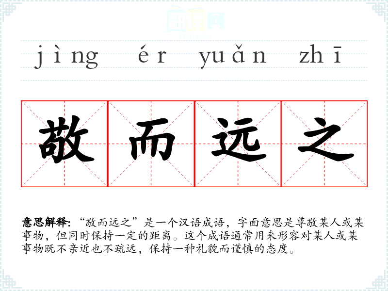 “敬而远之”是一个汉语成语,字面意思是尊敬某人或某事物,但同时保持一定的距离。这个成语通常用来形容对某人或某事物既不亲近也不疏远,保持一种礼貌而谨慎的态度。
