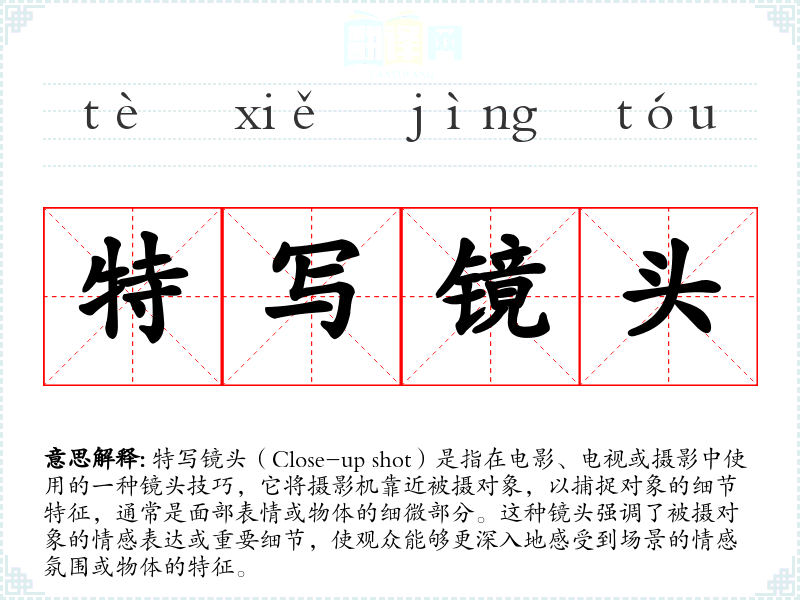 “特写镜头”一词源自电影摄影术语,随着电影技术的发展,这一概念逐渐被广泛应用于电视、摄影和其他视觉艺术领域。