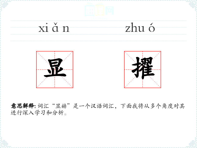 - 文学:在文学作品中,“显赫”常用来形容人物的背景或成就,如“他出生在一个显赫的家族”。