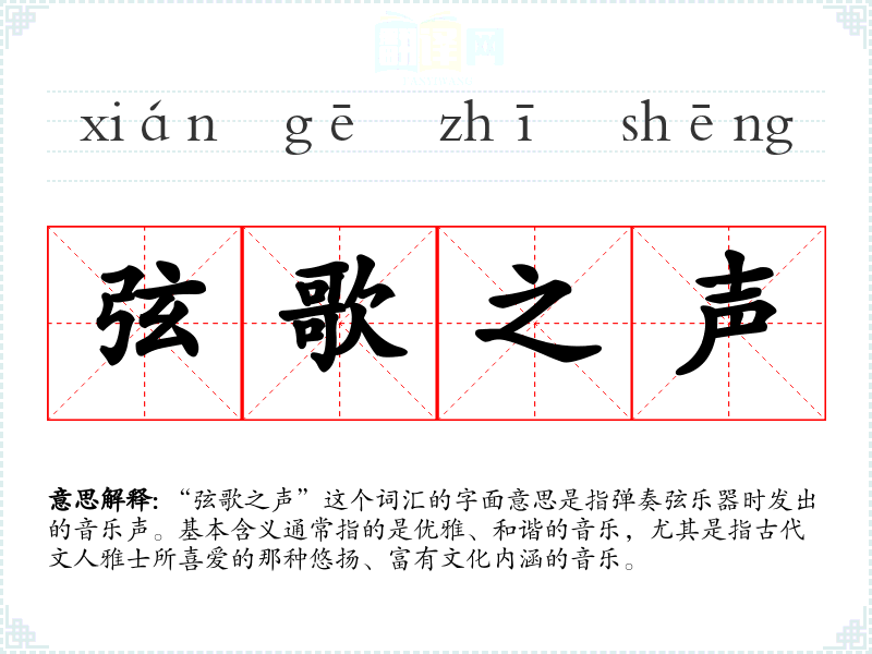 “弦歌之声”这个词汇的字面意思是指弹奏弦乐器时发出的音乐声。基本含义通常指的是优雅、和谐的音乐,尤其是指古代文人雅士所喜爱的那种悠扬、富有文化内涵的音乐。