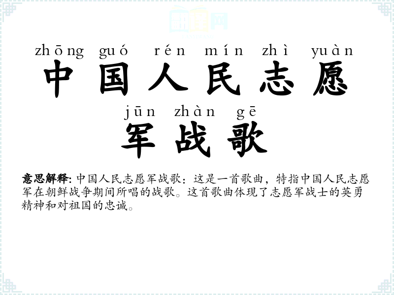 《人民志愿军战歌》不仅是一首歌曲,它是历史和文化的重要组成部分。它传递的不仅是战斗的勇气,更是对和平的渴望和对英雄的纪念。在语言学*和表达中,了解和理解这样的词汇对于深入把握文化内涵和历史背景至关重要。