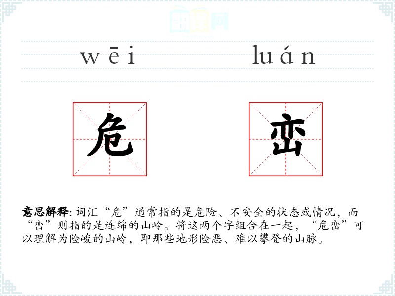 词汇“危”通常指的是危险、不安全的状态或情况,而“峦”则指的是连绵的山岭。将这两个字组合在一起,“危峦”可以理解为险峻的山岭,即那些地形险恶、难以攀登的山脉。