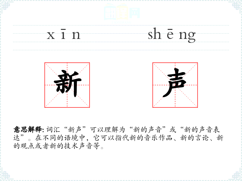 “新声”这个词在中文中直接表达了新的声音或新的表达方式的概念。随着社会的发展,这个词的含义也在不断扩展,从最初的声音概念延伸到更广泛的表达和创新领域。