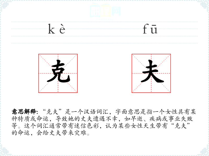 “克夫”是一个汉语词汇,字面意思是指一个女性具有某种特质或命运,导致她的丈夫遭遇不幸,如早逝、疾病或事业失败等。这个词汇通常带有迷信色彩,认为某些女性天生带有“克夫”的命运,会给丈夫带来灾难。