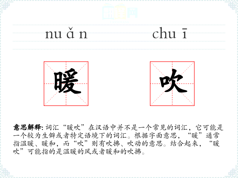 词汇“暖吹”在汉语中并不是一个常见的词汇,它可能是一个较为生僻或者特定语境下的词汇。根据字面意思,“暖”通常指温暖、暖和,而“吹”则有吹拂、吹动的意思。结合起来,“暖吹”可能指的是温暖的风或者暖和的吹拂。