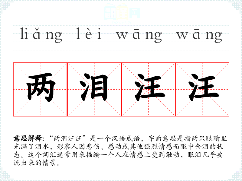 - 文学语境:在文学作品中,“两泪汪汪”常用于描写人物的内心情感,如在描述离别、失恋、亲人去世等场景时,作者可能会用这个词汇来增强情感的表达。