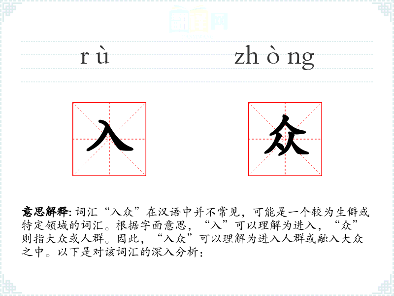 词汇“入众”在汉语中并不常见,可能是一个较为生僻或特定领域的词汇。根据字面意思,“入”可以理解为进入,“众”则指大众或人群。因此,“入众”可以理解为进入人群或融入大众之中。以下是对该词汇的深入分析: