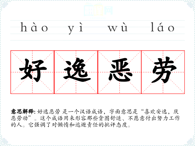 好逸恶劳 是一个汉语成语,字面意思是“喜欢安逸,厌恶劳动”。这个成语用来形容那些贪图舒适、不愿意付出努力工作的人。它强调了对懒惰和逃避责任的批评态度。