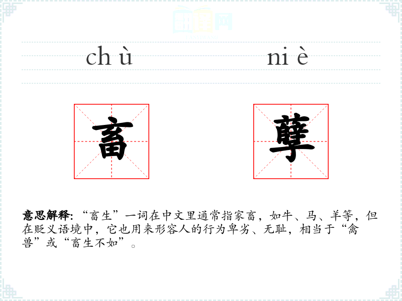 “畜生”一词在中文里通常指家畜,如牛、马、羊等,但在贬义语境中,它也用来形容人的行为卑劣、无耻,相当于“禽兽”或“畜生不如”。