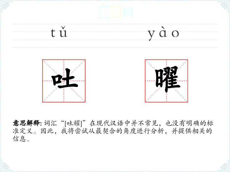 由于“[吐耀]”不是一个标准的汉语词汇,我们无法提供一个确切的字面意思和基本含义。它可能是由两个汉字组合而成的新词或特定领域的术语,但在通用汉语中并不存在。