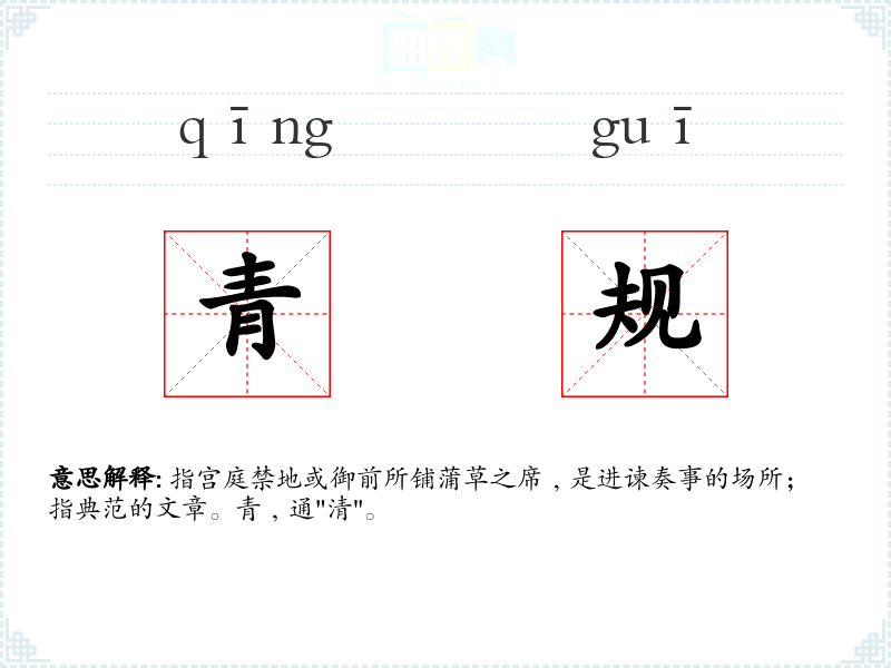 指宫庭禁地或御前所铺蒲草之席﹐是进谏奏事的场所; 指典范的文章。青﹐通"清"。