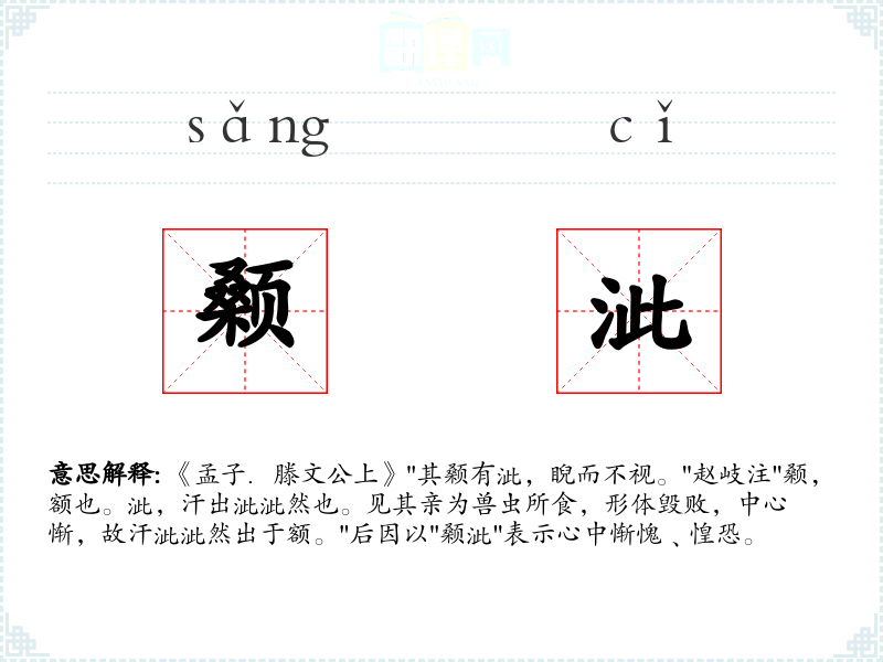 《孟子.滕文公上》"其颡有泚,睨而不视。"赵岐注"颡,额也。泚,汗出泚泚然也。见其亲为兽虫所食,形体毁败,中心惭,故汗泚泚然出于额。"后因以"颡泚"表示心中惭愧﹑惶恐。