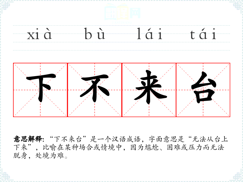 “下不来台”是一个汉语成语,字面意思是“无法从台上下来”,比喻在某种场合或情境中,因为尴尬、困难或压力而无法脱身,处境为难。